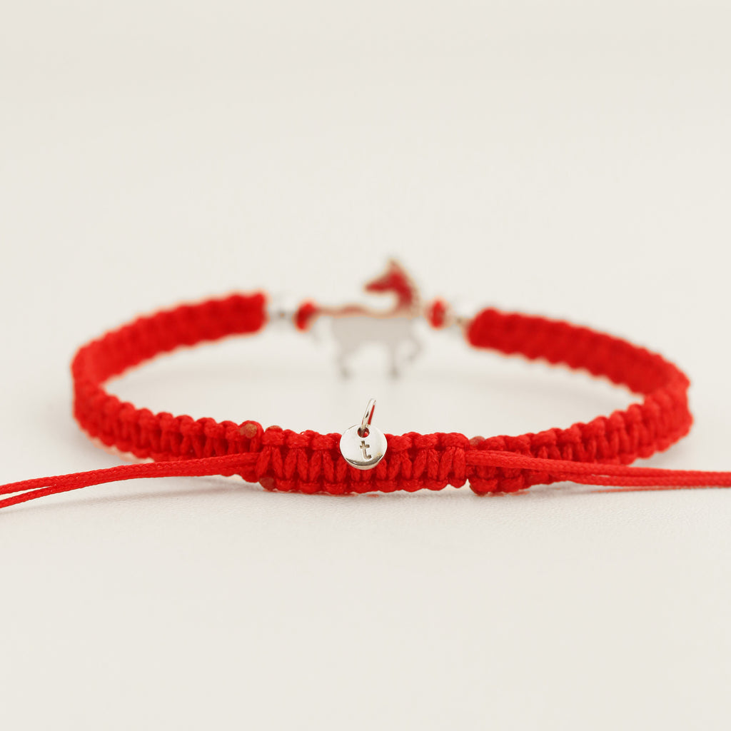 This lucky red macrame bracelet is inspired by ancient traditions and infused with modern charm, featuring your Chinese zodiac sign as its centerpiece and a round plaque at the back for your personalized initial.
